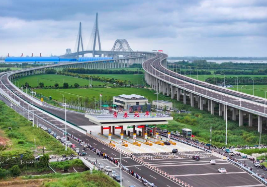 An aerial drone photo taken on Sept. 9, 2025 shows vehicles passing a toll gate of the Changtai Yangtze River Bridge, seen from the north bank of the Yangtze River, in east China's Jiangsu Province. (Photo by Gu Jihong/Xinhua)