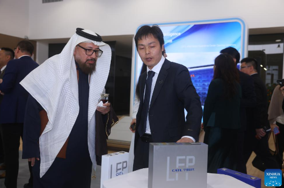 Bruce Li (R, front), president of aftermarket and battery management at Contemporary Amperex Technology Co. Ltd, introduces battery products to Anbasa Kandiel (L, front), chief advisor of the Saudi Ministry of Industry and Mineral Resources, at the Middle East's first NING SERVICE Experience Center in Riyadh, Saudi Arabia on Jan. 10, 2026. Chinese battery giant Contemporary Amperex Technology Co. Ltd (CATL) on Saturday opened the Middle East's first NING SERVICE Experience Center in Riyadh, marking its largest new energy aftermarket facility outside China. (CATL/Handout via Xinhua)