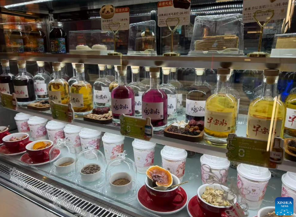 A variety of drinks infused with herbal ingredients are available at a Tong Ren Tang's coffee shop Zhima Health in Chengdu, southwest China's Sichuan Province, Dec. 15, 2025. (Photo by Wu Xiao/Xinhua)