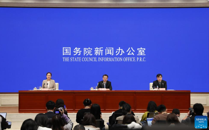 Head of the National Bureau of Statistics (NBS) Kang Yi (C), and Fu Linghui (R), spokesperson and chief economist of the NBS and director general of the Department of Comprehensive Statistics of the NBS, attend a press conference held by the State Council Information Office (SCIO) on China's economic performance in 2025, in Beijing, capital of China, on Jan. 19, 2026. (Xinhua/Shan Yuqi)