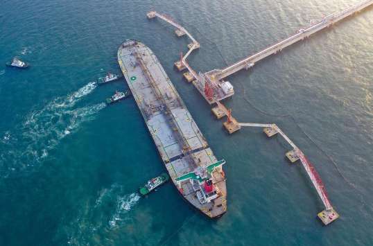 An aerial drone photo shows a vessel carrying 179,000 tonnes of petrochemical raw materials berthing at Yangpu Port in Danzhou, south China's Hainan Province, Dec. 18, 2025. (Xinhua/Guo Cheng)