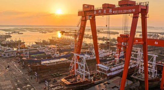 An aerial drone photo taken on Dec. 24, 2025 shows a shipbuilding enterprise conducting shipbuilding work in Rongcheng, east China's Shandong Province. (Photo by Li Xinjun/Xinhua)