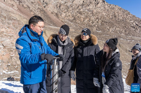 Wang Feiteng (1st L), a glacier scientist at the Chinese Academy of Sciences, explains ice core drilling operation to a group of young Chinese explorers on the Urumqi Glacier No. 1 in northwest China's Xinjiang Uygur Autonomous Region, Dec. 23, 2025. (Polar Hub/Handout via Xinhua)