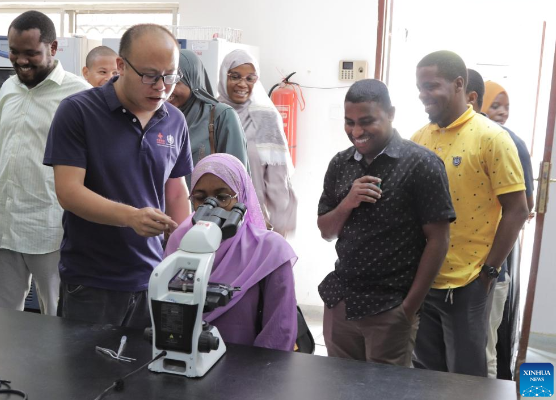 A Chinese expert demonstrates microscopic examination of schistosomiasis on Pemba Island of Zanzibar, Tanzania, Jan. 28, 2026. The expert team of the China-aided Zanzibar schistosomiasis prevention and control project has organized an awareness campaign and a diagnostic training course on Pemba Island in Tanzania's Zanzibar to mark the 2026 World Neglected Tropical Diseases (NTDs) Day. (The expert team of the China-aided Zanzibar schistosomiasis prevention and control project/Handout via Xinhua)