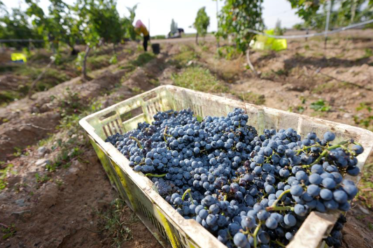 Farmers harvest wine grapes at Minning Town, Yongning County in Yinchuan, northwest China's Ningxia Hui Autonomous Region, Oct. 14, 2025. (Xinhua/Yang Zhisen)