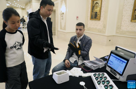 A man tries a medical device at an exhibition during the Joint International Pharmacy Conference 2026 in Cairo, Egypt, Feb. 1, 2026. The Joint International Pharmacy Conference 2026 wrapped up in Cairo on Monday after two days of discussions on combining Western pharmaceuticals and traditional Chinese medicine, with a focus on the use of artificial intelligence. (Xinhua/Ahmed Gomaa)
