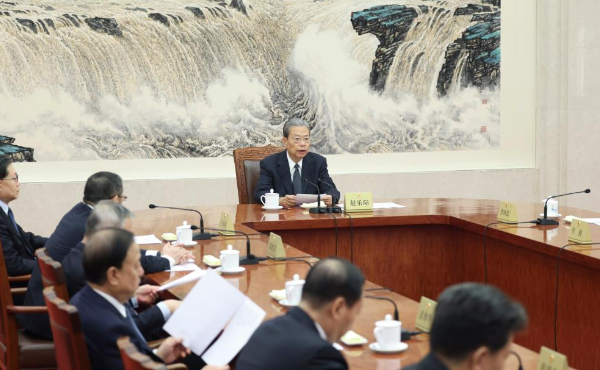 Zhao Leji, chairman of the National People's Congress (NPC) Standing Committee, presides over the 59th meeting of the Council of Chairpersons of the 14th NPC Standing Committee at the Great Hall of the People in Beijing, capital of China, Feb. 2, 2026. (Xinhua/Ding Lin)