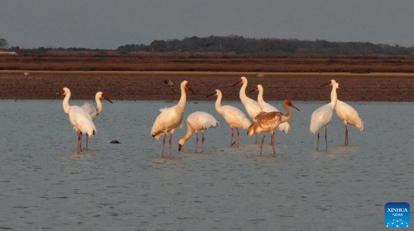 Siberian cranes are pictured at Poyang Lake wetland in east China's Jiangxi Province, Nov. 18, 2025. (Photo by Yu Qiwen/Xinhua)