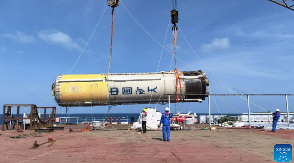 The first stage of the Long March-10 carrier rocket has been successfully fished out and retrieved from the sea, marking China's completion of its first-ever rocket first-stage booster maritime salvage and recovery mission.
