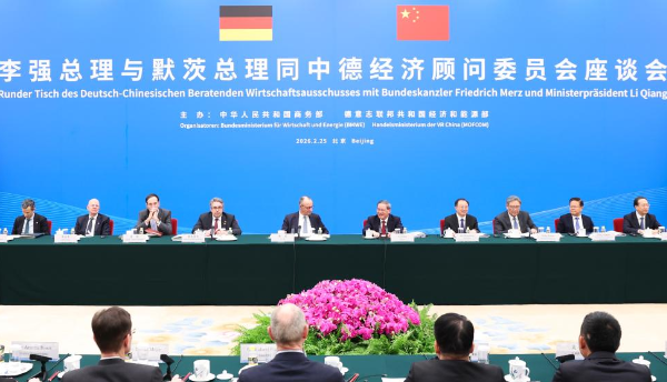 Chinese Premier Li Qiang and German Chancellor Friedrich Merz attend a symposium of the China-Germany economic advisory committee at the Great Hall of the People in Beijing, capital of China, Feb. 25, 2026. (Xinhua/Huang Jingwen)