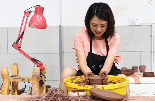 In a pottery studio in the Rongchang district of southwest China's Chongqing Municipality, 9-year-old Yang Hanlin holds his breath, his small hands carefully shaping a mound of clay spinning on a wheel as his instructor offers careful advice.