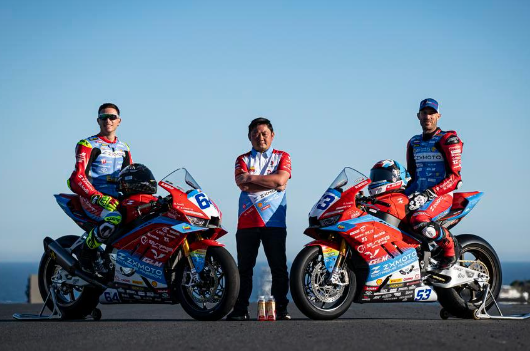 French rider Valentin Debise (R) and Italian rider Federico Caricasulo (L) pose with Zhang Xue (C), brand founder and owner of Chinese motorcycle manufacturer ZXMOTO, at Phillip Island Grand Prix Circuit in Australia, Feb. 20, 2026. (Xinhua)