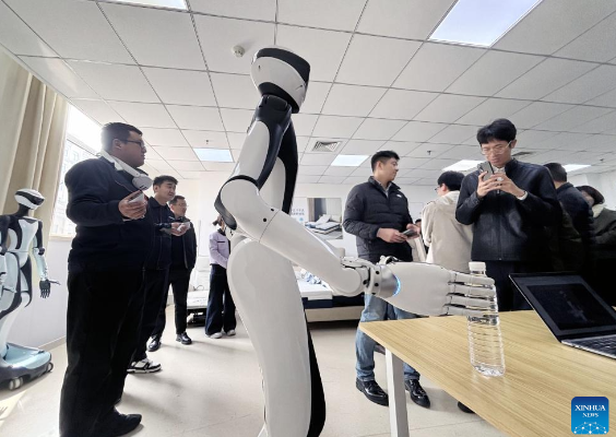 This photo taken by a cellphone on March 18, 2026 shows people visiting the Qingdao Training Center for Elderly Care Robots in Qingdao, east China's Shandong Province. (Xinhua)