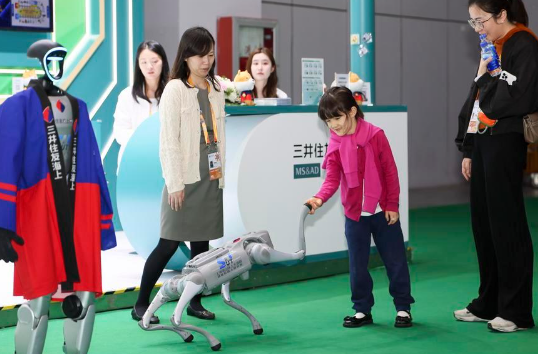 A child interacts with a robotic dog at the Trade in Services Exhibition area during the eighth China International Import Expo (CIIE) in east China's Shanghai, Nov. 9, 2025. (Xinhua/Wang Xiang)