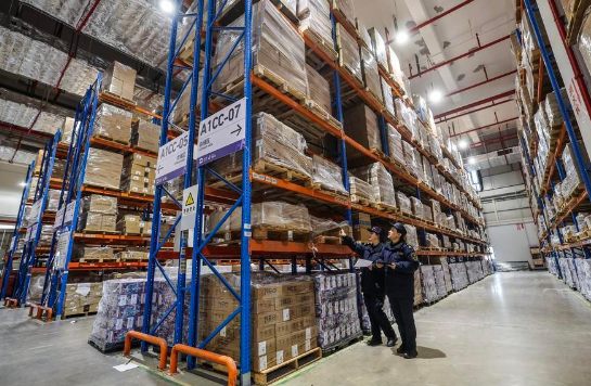 Customs officers conduct inspections at the warehouse of a cross-border e-commerce enterprise at the Yiwu Comprehensive Bonded Zone in Yiwu, east China's Zhejiang Province, Jan. 30, 2026. (Xinhua/Xu Yu)