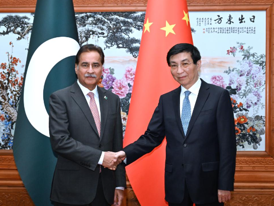 China's top political advisor Wang Huning met with Sardar Ayaz Sadiq, speaker of the National Assembly of Pakistan, in Beijing on Tuesday.