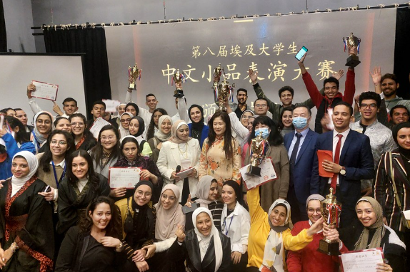 At a theater decorated with Chinese-style red lanterns, a group of Egyptian students are singing, dancing and acting on the stage in fluent Chinese.