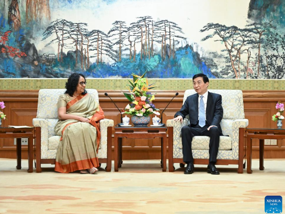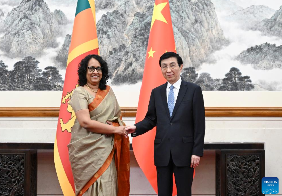 China's top political advisor Wang Huning on Monday met with Sri Lankan Prime Minister Harini Amarasuriya, who is in Beijing for the Global Leaders' Meeting on Women.