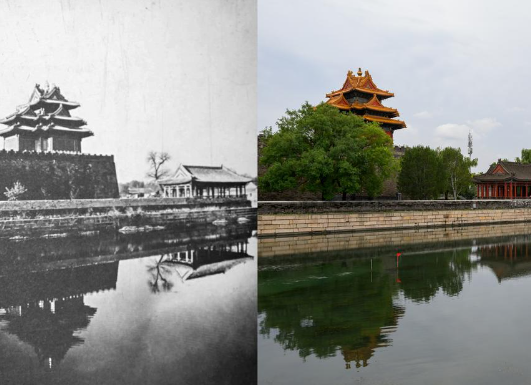 This combo photo shows a turret of the Palace Museum in the early 20th century (L, provided by the Palace Museum) and on Oct. 10, 2025 (R, photo by Xinhua photographer Jin Liangkuai) in Beijing, capital of China. (Xinhua)