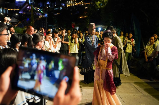 Tourists watch a performance at a scenic area in Hepu County of Beihai City, south China's Guangxi Zhuang Autonomous Region, Oct. 20. 2025. (Xinhua/Zhou Jiayi)