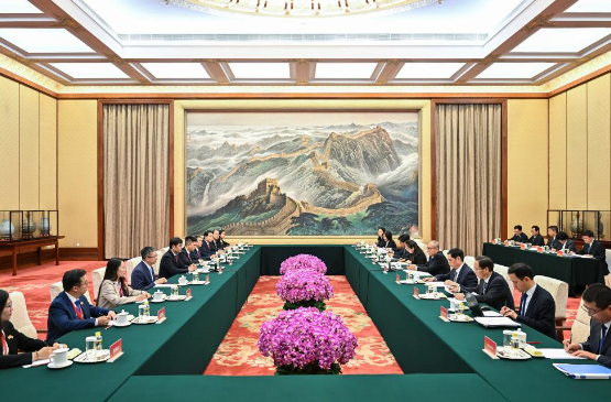 Li Hongzhong, a member of the Political Bureau of the Communist Party of China (CPC) Central Committee and vice chairman of the National People's Congress Standing Committee, meets with Bui Quang Huy, vice president of the Central Committee of the Vietnam Fatherland Front and first secretary of the Central Committee of the Ho Chi Minh Communist Youth Union, in Beijing, capital of China, Nov. 4, 2025. (Xinhua/Li Xin)