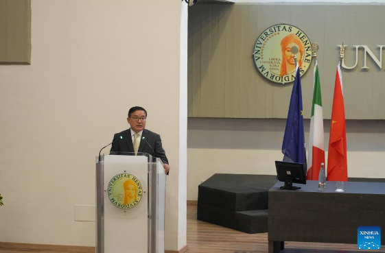 Chinese Ambassador to Italy Jia Guide delivers a speech at the opening ceremony of a series of events marking the 400th anniversary of the birth of Prospero Intorcetta at the Kore University of Enna in Sicily, Italy, Nov. 11, 2025. (Xinhua/Ren Yaoting)