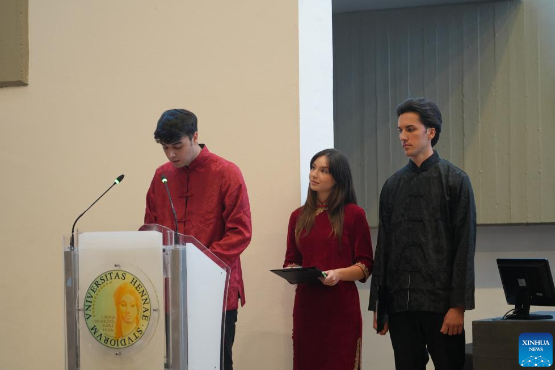 Italian students deliver a bilingual recitation of extracts from The Doctrine of the Mean during the opening ceremony of a series of events marking the 400th anniversary of the birth of Prospero Intorcetta at the Kore University of Enna in Sicily, Italy, Nov. 11, 2025. (Xinhua/Ren Yaoting)