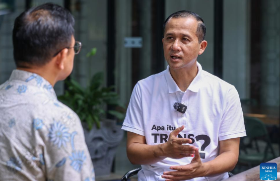 Indonesia's Minister of Transmigration Muhammad Iftitah Sulaiman Suryanagara (R) speaks during an interview with Xinhua in Jakarta, Indonesia, Nov. 16, 2025. (Xinhua)