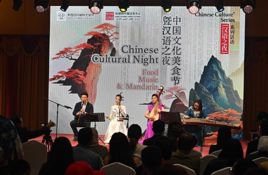 People enjoy Chinese traditional instrumental works during the Chinese culture night event at the Chinese Embassy in Kuwait in Hawalli Governorate, Kuwait, Nov. 26, 2025. (Photo by Asad/Xinhua)