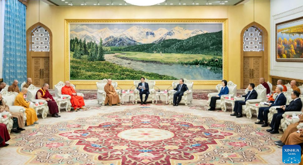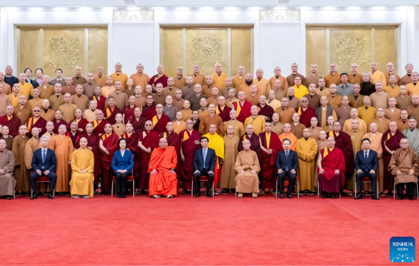 Wang Huning, a member of the Standing Committee of the Political Bureau of the Communist Party of China (CPC) Central Committee and chairman of the Chinese People's Political Consultative Conference (CPPCC) National Committee, meets with delegates attending a national congress of the Buddhist Association of China in Beijing, capital of China. The 11th national congress of the Buddhist Association of China was held from Sunday to Monday in Beijing. (Xinhua/Zhai Jianlan)
