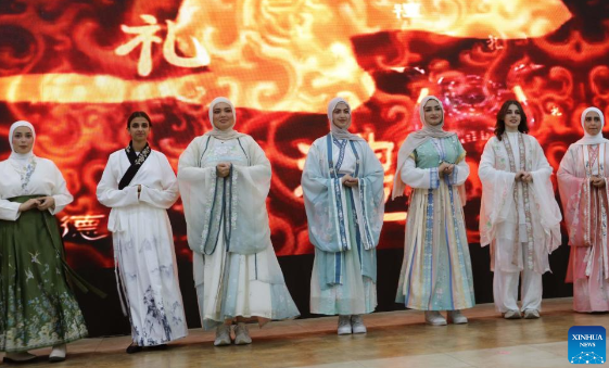 Students from Philadelphia University in Jordan display Hanfu in Amman, Jordan, on Jan. 12, 2026. (Photo by Mohammad Abu Ghosh/Xinhua)