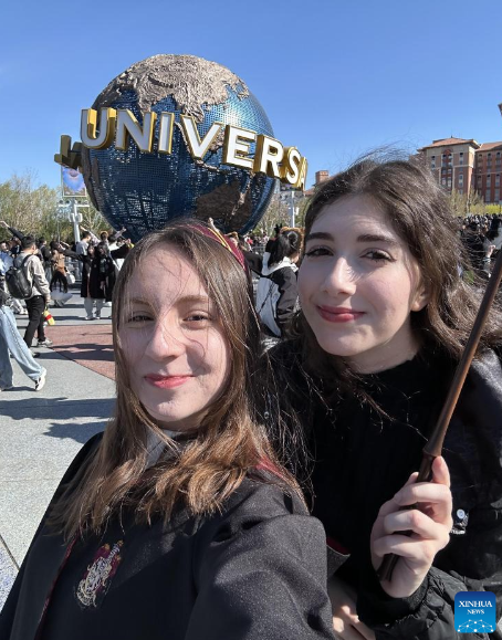 Türkan Hamza (R), a Turkish student majoring in Chinese-English translation, poses for photos with her friend at the Universal Beijing Resort in Beijing, capital of China, April 5, 2025. (Xinhua)