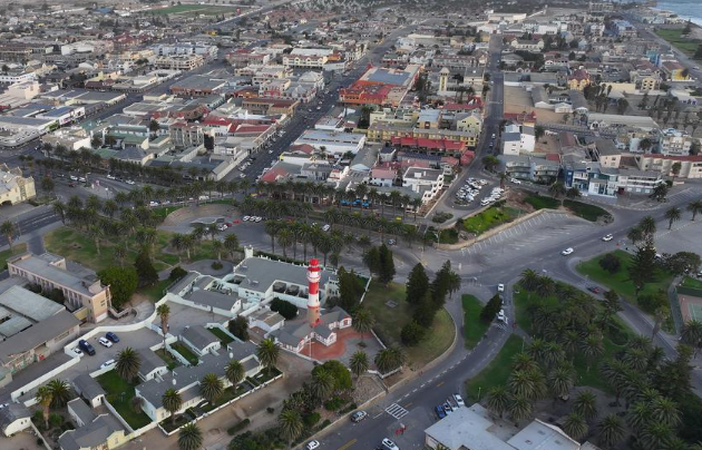 An aerial drone photo taken on March 25, 2024 shows a street view in Swakopmund, Namibia. (Xinhua/Chen Cheng)