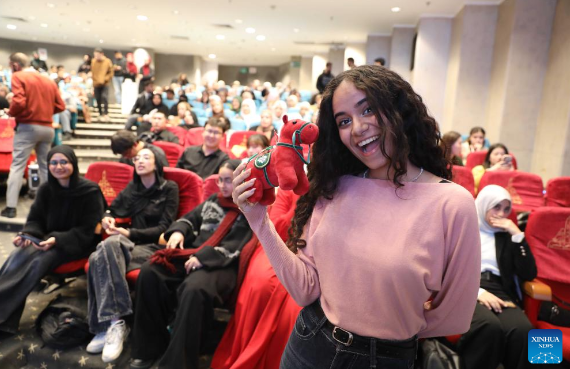 Egyptian Students celebrate the Chinese New Year at Ain Shams University in Cairo, Egypt, on Feb. 10, 2026. A Chinese New Year celebration for the Year of the Horse was held Tuesday at Ain Shams University in Cairo, bringing together Chinese teachers and Egyptian students for a festive showcase of cultural exchange and deepening friendship. (Xinhua/Ahmed Gomaa)