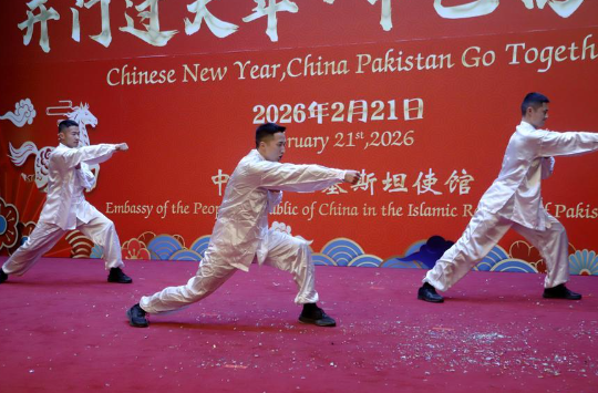 People perform during a Spring Festival celebration in Islamabad, capital of Pakistan, on Feb. 21, 2026. (Xinhua/Zhang Jingyao)