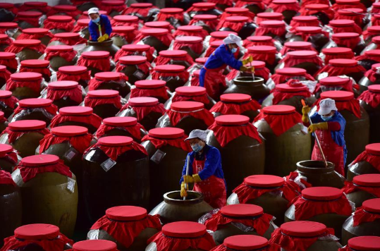 Workers stir sour soup, a local traditional food made from fresh chilies, tomatoes and gingers, in fermentation at a food processing plant in Majiang county of Qiandongnan Miao and Dong Autonomous Prefecture, southwest China's Guizhou Province, Dec. 3, 2020. (Photo by Yang Wukui/Xinhua)
