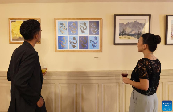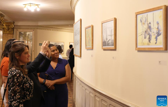 Visitors watch Brazilian paintings at a Chinese-Brazilian calligraphy and painting exhibition at the Municipal Theatre of Rio de Janeiro in Brazil, March 25, 2026. The exhibition, themed on "Horizons in Dialogue," kicked off in Rio de Janeiro on Wednesday. (Xinhua/Jin Haoyuan)