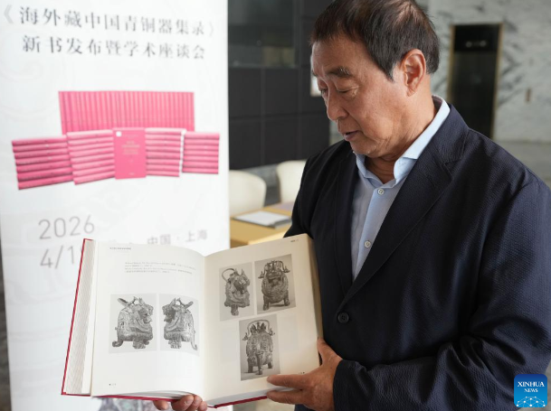 Professor Zhu Fenghan, the lead editor of a sixty-volume compendium documenting more than 23,000 ancient Chinese bronze artifacts lost abroad, displays detailed contents in one of the books during a press conference for the books' release in east China's Shanghai, April 19, 2026. (Xinhua/Liu Ying)