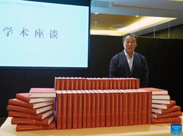 Professor Zhu Fenghan, the lead editor of a sixty-volume compendium documenting more than 23,000 ancient Chinese bronze artifacts lost abroad, poses for a photo during a press conference for the books' release in east China's Shanghai, April 19, 2026. (Xinhua/Liu Ying)