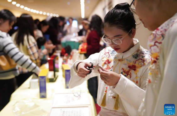 A girl learns to make a paper cutting work during a cultural event marking the seventh United Nations Chinese Language Day at the UN headquarters in New York, on April 20, 2026. (Xinhua/Zhang Fengguo)
