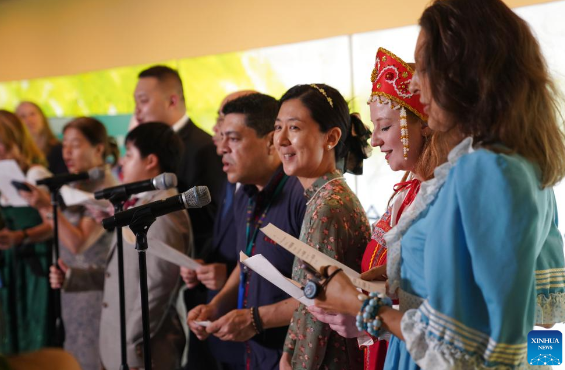 Participants recite poems from ancient China's Tang Dynasty (618-907) during a cultural event marking the seventh United Nations Chinese Language Day at the UN headquarters in New York, on April 20, 2026. (Xinhua/Zhang Fengguo)