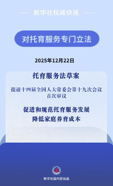 12月22日,备受瞩目的托育服务法草案提请十四届全国人大常委会第十九次会议首次审议。制定托育服务法,是党和国家用法治呵护三周岁以下最柔弱的婴幼儿群体、为万千家庭纾解“育儿焦虑”的重要一步。
