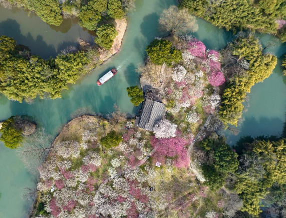 2025年2月26日,游船经过杭州西溪湿地一片盛开的梅林(无人机照片)。新华社记者 翁忻旸 摄