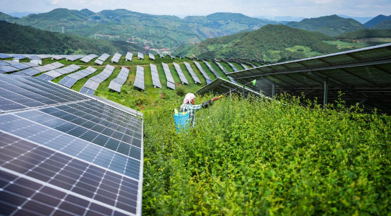 2025年7月3日,当地村民在贵州金元么站农业光伏电站光伏板间的土地上劳作。新华社记者 陶亮 摄