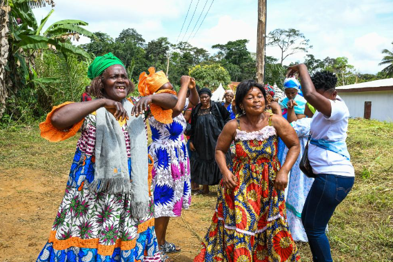 2025年10月8日,在喀麦隆松明比亚斯村,村民庆祝中国企业建设的农村离网太阳能电站项目正式启用。新华社发(科普索摄)