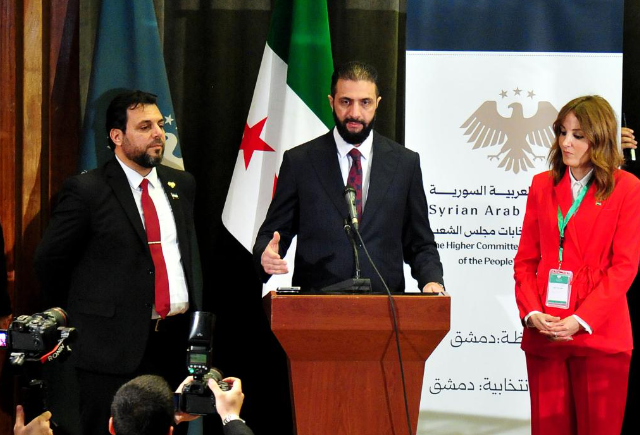 10月5日,在叙利亚首都大马士革,叙政权领导人艾哈迈德·沙拉(中)出现在政局剧变后首次立法机构选举的投票现场。新华社发(阿马尔·萨法尔贾拉尼摄)