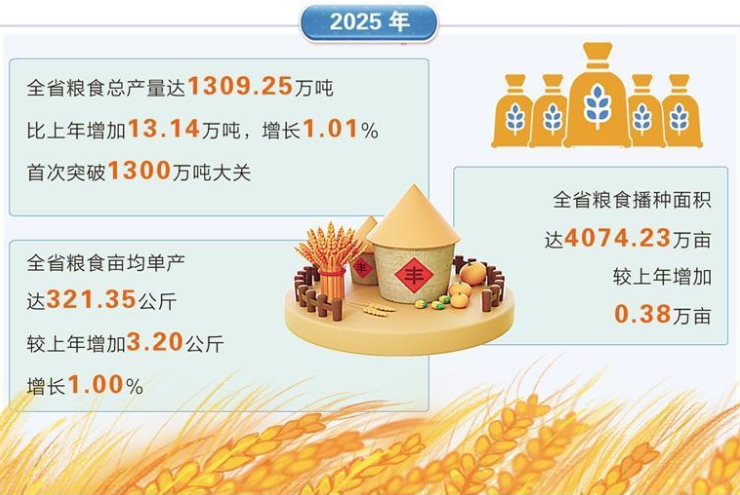 记者从省农业农村厅获悉,经国家统计局甘肃调查总队发布,2025年全省粮食总产量达1309.25万吨,比上年增加13.14万吨,增长1.01%,首次突破1300万吨大关。标志着我省粮食生产能力迈上新台阶,对巩固全省经济向好态势、持续推动经济社会高质量发展具有重要意义。