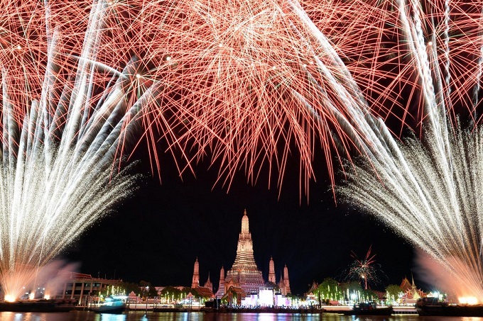这是2023年1月1日在泰国曼谷郑王庙上空拍摄的新年烟花。新华社发(拉亨摄)