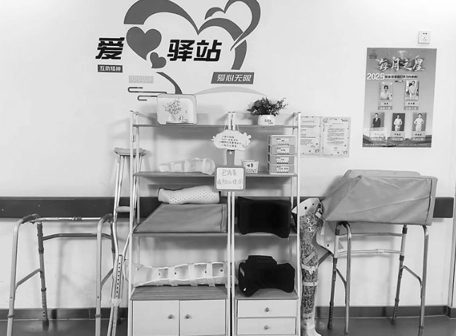 走进甘肃省中心医院骨科病区,走廊上有一处“爱心驿站”——共享护具平台,拐杖、固定用具等护具整齐地摆放在架子上,旁边张贴着“骨科护具共享倡议书”,以及“我已初愈,无需用它,赠给有需要的人,祝早日康复”“已消毒,请放心使用”等暖心标识。