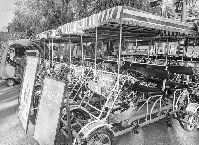 共享观光脚踏车深受外地游客以及带小孩游客的青睐。